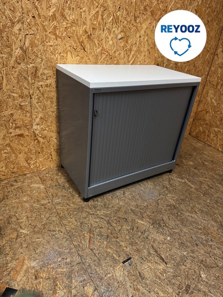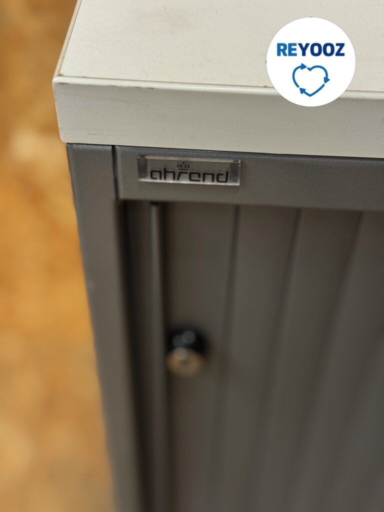 Ahrend roldeurkast in de maat 74x80x45cm in de kleur zilvergrijs met grijze deur. Compacte kwaliteitskast voor het opbergen van (kantoor)spullen.